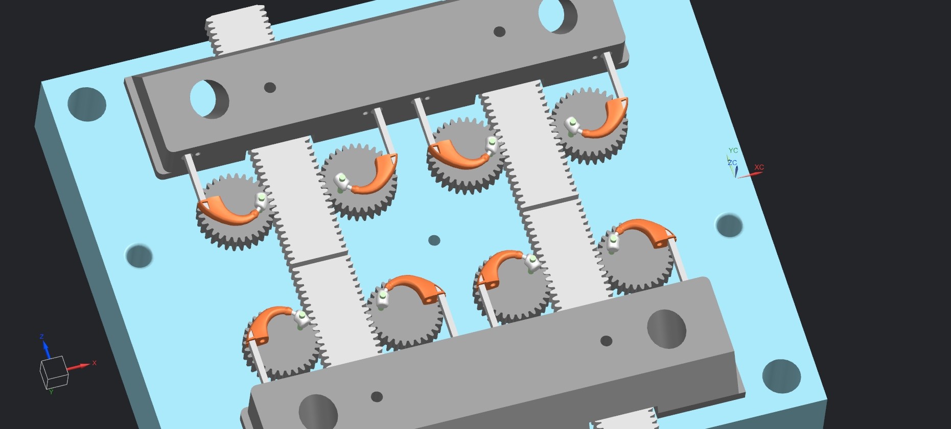 ANDYSIS scanned the existing component to capture accurate geometry and created a clean CAD model. Various mechanical options were studied to resolve the undercut, including sun-and-planet systems, rack-and-pinion, and other gear mechanisms. After evaluating reliability, simplicity, and cost, a rack-and-pinion system was selected and integrated into the mold design. The mold was finalized as an automatic 8-cavity system. The Step Followed: 1. Study of the existing manual mold and part geometry. 2. 3D scanning and CAD remodeling of the component. 3. Undercut identification and automation feasibility analysis. 4. Evaluation of different gear mechanisms for undercut release. 5. Selection and integration of the rack & pinion system. 6. Design of an 8-cavity automatic mold. 7. Simulation of the mold assembly and mechanism movement to validate operation. A fully automatic 8-cavity mold was successfully developed using a rack-and-pinion mechanism to resolve undercuts. The new mold significantly improved production efficiency, consistency, and cycle time while eliminating manual intervention.