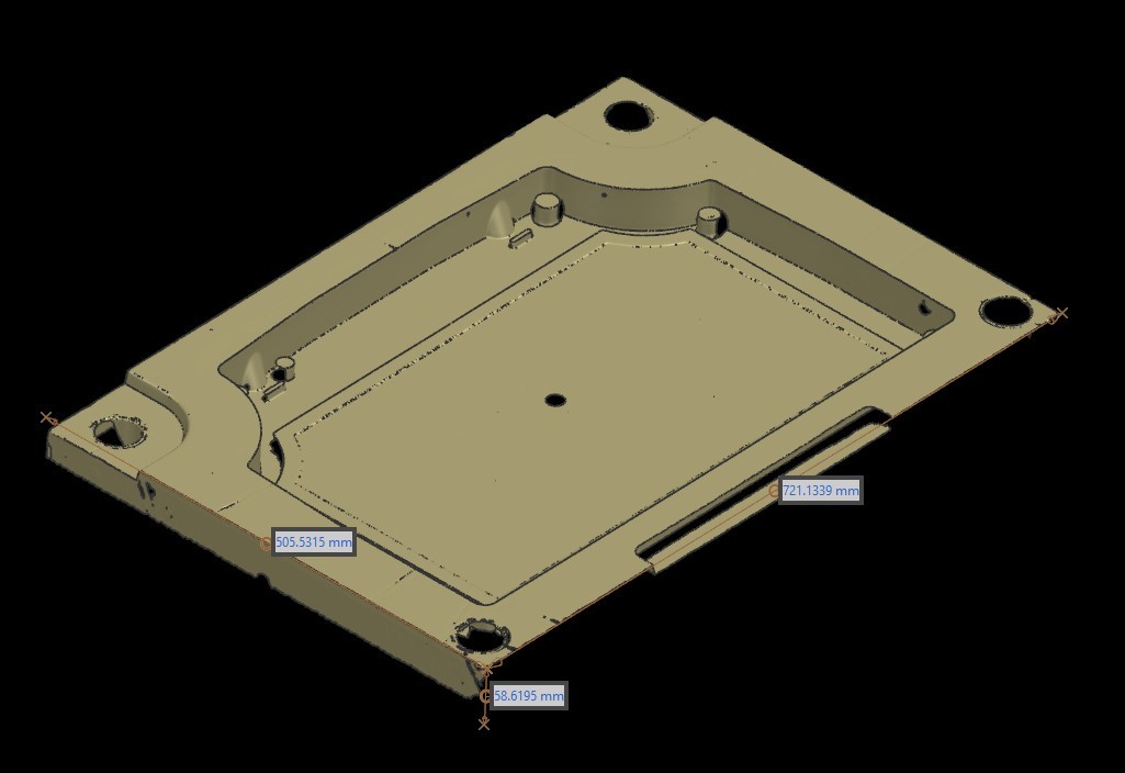ANDYSIS proposed a scan-based redesign approach. The existing cavity plate was scanned, and three CAD models were created: the original product, the modified design feature, and the final intended product. Shrinkage allowance was applied, and the updated product geometry was carefully integrated into the cavity plate. Replaceable inserts were designed to allow easy switching between the plain and redesigned product versions. The process followed: 1. Understanding the existing cavity plate and production constraints. 2. 3D scanning of the cavity plate to capture accurate geometry. 3. Modeling of the original product, modified design, and final integrated product. 4. Application of material shrinkage allowance. 5. Design and integration of two interchangeable cavity inserts. 6. Core-side redesign with two corresponding inserts to maintain uniform wall thickness. The client received a flexible mold solution that allowed production of both the original and redesigned battery base using the same mold setup. The insert-based approach minimized downtime, reduced tooling cost, and ensured consistent wall thickness and product quality across both design variants.